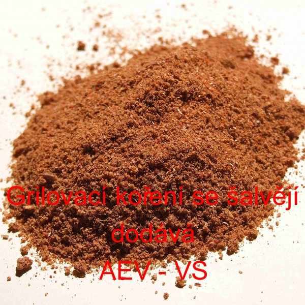 Popis: Grilovací koření se šalvějí, obsahuje: asi 43% jedlé kuchyňské soli, papriku, hořčici (alergen č.10), koriandr, kmín, česnek, asi 2% šalvěje, rostlinný olej (řepkový), protispékavou látku E 341iii