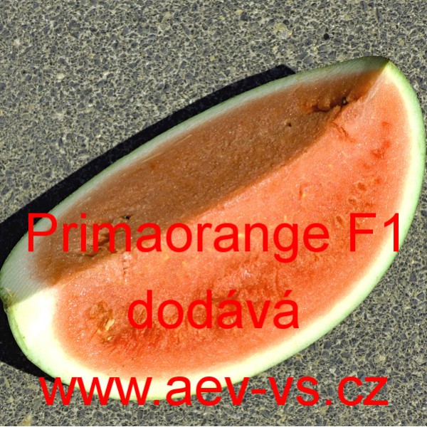 Popis: Meloun vodní (Citrullus lanatus) Primaorange F1 je raný hybridní vodní meloun se sladkou jasně oranžovou dužninou. Vytváří kulovité 2 až 4 kilogramové zelené pruhované plody. Pevné šťavnaté příjemně aromatické plody obsahují poměrně málo semen. V příhodných podmínkách může jeho dužnina obsahovat až asi 11 až 12% cukru.