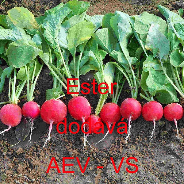 Ředkvička (Raphanus sativus var. sativus) Ester je velmi raná červená kulovitá ředkvička vhodná k rychlení i pro "celoroční" pěstování na záhonu.