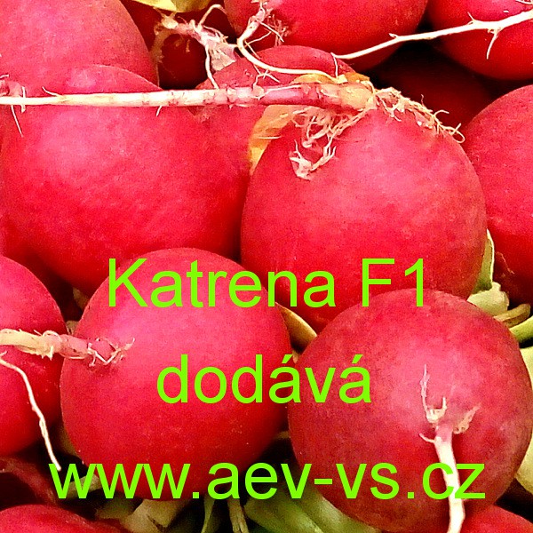 Popis: Ředkvička (Raphanus sativus var. sativus) Katrena F1 je raná celoroční chorobám odolná červená kulovitá hybridní ředkvička na záhon. Vytváří tmavočervené bulvičky, vysoce kvalitní bílou křupavou šťavnatou dužninu, krátké pevné listy a jemný kořínek. Hodí se i na jarní a podzimní pěstování pod textilií. Je vysoce odolná k vykvétání.