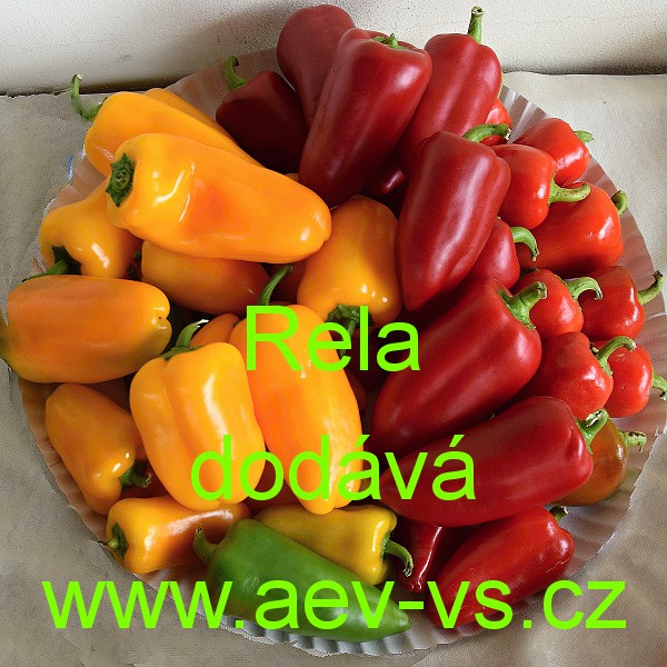 Paprika roční zeleninová (Capsicum annuum L.) Rela je raná/poloraná menší lahůdková zelená po dozrání červená lichoběžníkovitá zeleninová paprika roční do velkého květináče, truhlíku, okrasného koryta a také na záhon, do skleníku a fóliovníku. Na rostlině dozrává v průměru asi 50 až 70 sladce aromatických plodů.