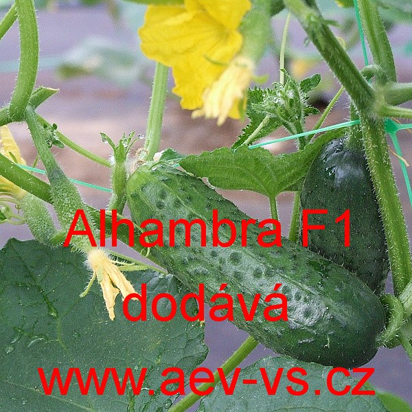 Popis: Okurka setá nakládačka (Cucumis sativus) Alhambra F1 je raná "hrubá" tmavě zelená chorobám odolná hybridní partenokarpická okurka setá nakládačka. Vytváří geneticky nehořké plody. Poměr délky a šířky je asi 3,6:1.