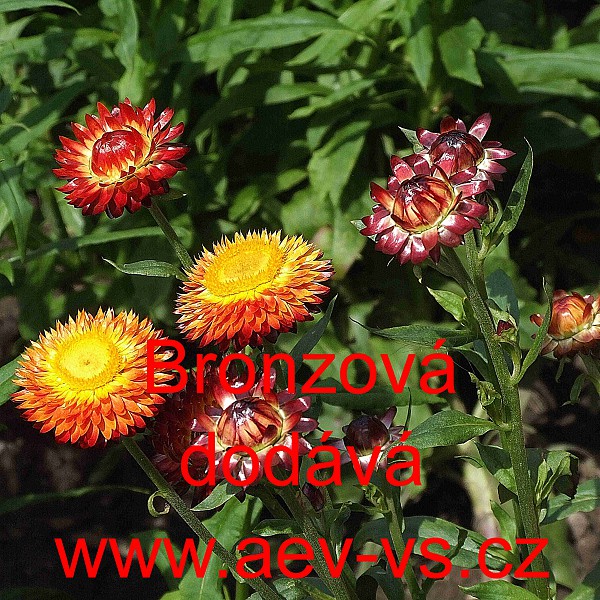 Popis: Smil listenatý, slaměnka (Helichrysum bracteatum) Bronzová (bronzově hnědá) je asi 80 centimetrů vysoká jednoletá květina. Dá se použít i k sušení, do zimních aranžmá.