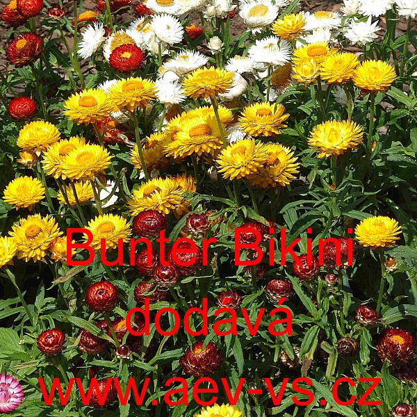 Popis: Smil listenatý, slaměnka (Helichrysum bracteatum) Bunter Bikini je asi 40 centimetrů vysoká směs jednoletých květin. Dá se použít i k sušení, do zimních aranžmá.