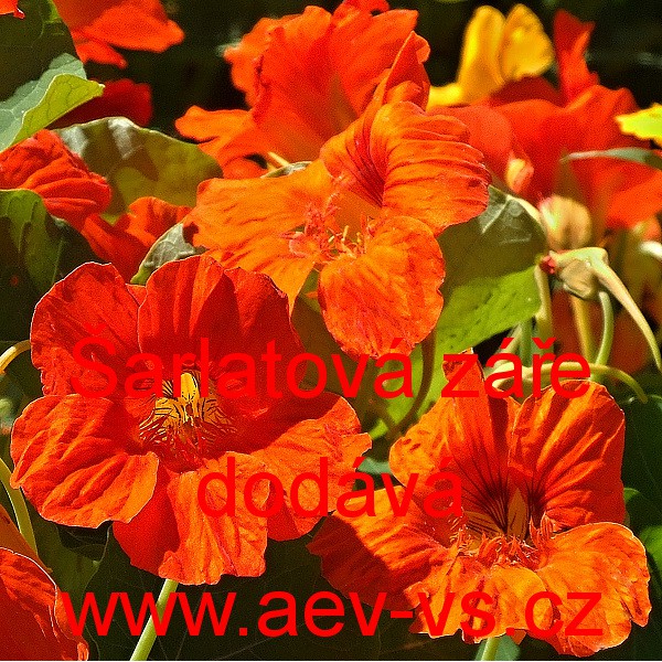 Popis: Lichořeřišnice větší, kapucínka (Tropaeolum majus) Šarlatová záře je asi 200 centimetrů vysoká pnoucí šarlatově červená jednoletá květina. Hodí se i do truhlíku, květináče a okrasného koryta.