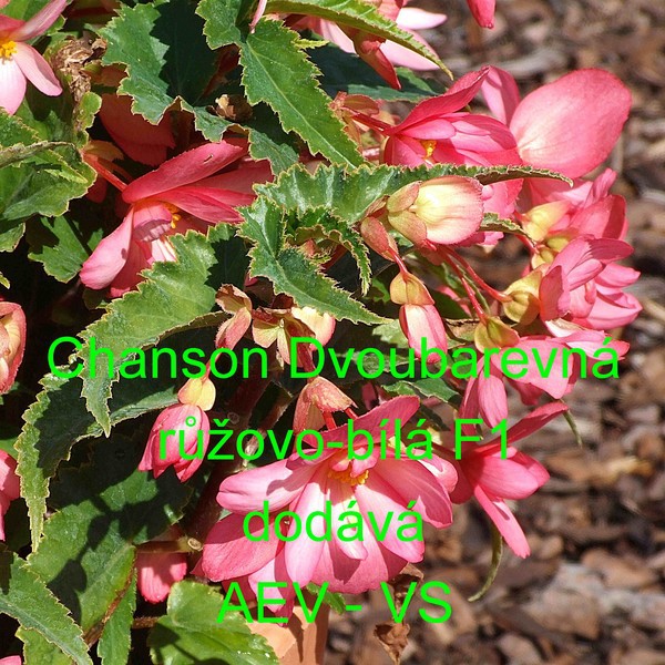 Kysala velkokvětá, hlíznatá, převislá (Begonia tuberhybrida pendula) Chanson Dvoubarevná růžovo/bílá F1 je nízká jednoletá květina. Vytváří až 50 centimetrů dlouhé kvetoucí převisy.