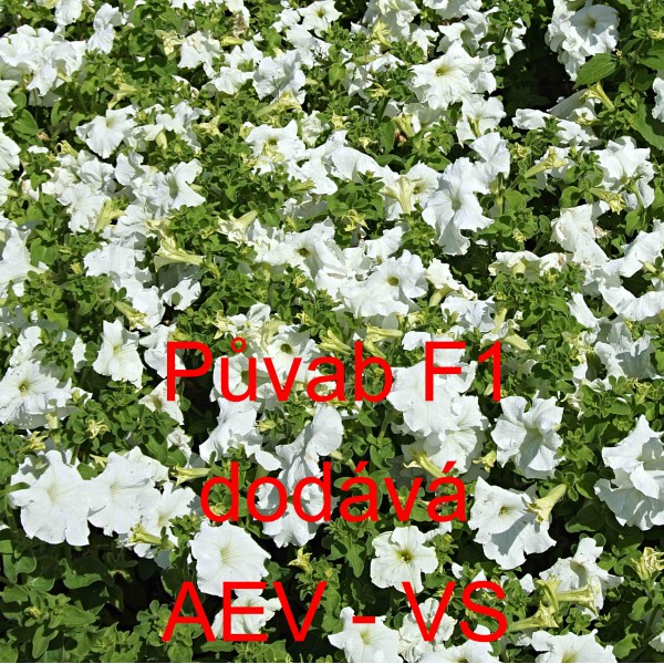 Popis: Petúnie velkokvětá, zkřížená, nízká (Petunia hybrida grandiflora nana) Půvab F1 je asi 35 centimetrů vysoká bílá velkokvětá jednoletá květina. V nádobách hlouběji přepadává přes okraje a vytváří nádherné převisy. Hodí se na záhon, do truhlíku, květináče a okrasného koryta. Semena se dodávají ve výběrové kvalitě Professional Seeds.